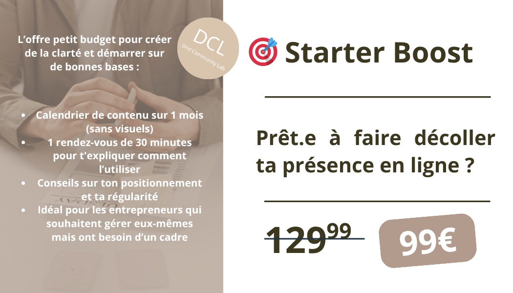 Le Starter Boost est une séance 1:1 ultra ciblée pour débloquer ta stratégie, clarifier ton message et repartir avec un plan d’action concret.